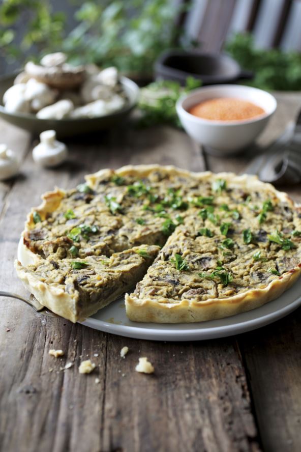 Brašno pomiješajte sa solju, dodajte margarin pa zamijesite tijesto, dodajući malo vode. Za nadjev skuhajte crvenu leću (omjer 1:2) te je izmiksajte. Na ulju pirjajte luk narezan na polumjesece, posoljene šampinjone narezane na listiće i kockice dimljenog tofua. Pirjanom povrću dodajte izmiksanu leću, začinite umeboshi octom i paprom te dodajte sojin jogurt i aru prah. Pećnicu zagrijte na 200 °C. Tijesto razvaljajte u krug malo veći od veličine posude u kojoj ćete peći (promjera 28-30 cm). Posudu premažite margarinom, stavite tijesto, izbodite ga vilicom te zapecite u zagrijanoj pećnici desetak minuta. Tijesto nadjenite i vratite u pećnicu na još 20-30 minuta, sve dok se nadjev ne zapeče. Prije posluživanja pospite usitnjenim svježim peršinom.