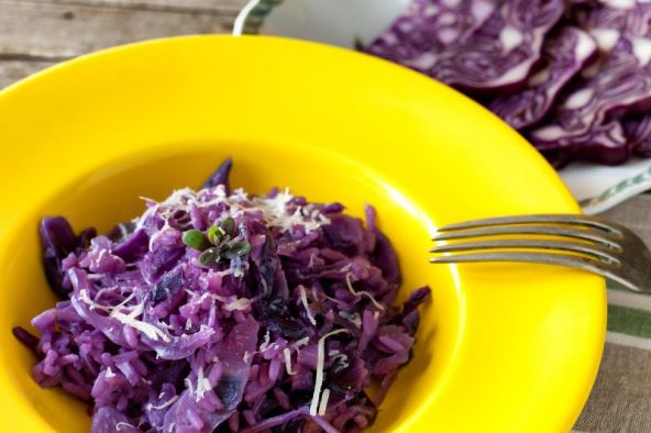 Dok se riža kuha, ostatak crvenoga kupusa narežite na tanke trakice, stavite na zagrijano maslinovo ulje, lagano posolite i prelijte bijelim octom. Pirjajte dok ne omekša. Kuhani rižoto poslužite s pirjanim kupusom te, ako želite, naribanim tvrdim sirom.