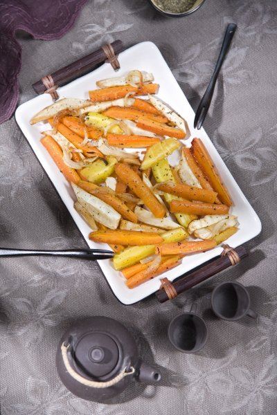 Mrkvu, peršin i pastrnjak narežite na četvrtine, luk na polumjesece. Miješano povrće stavite u lim za pečenje, prelijte marinadom i ostavite da odstoji barem 20 min. Zagrijte pećnicu na 200 stupnjeva i pecite 20 min.