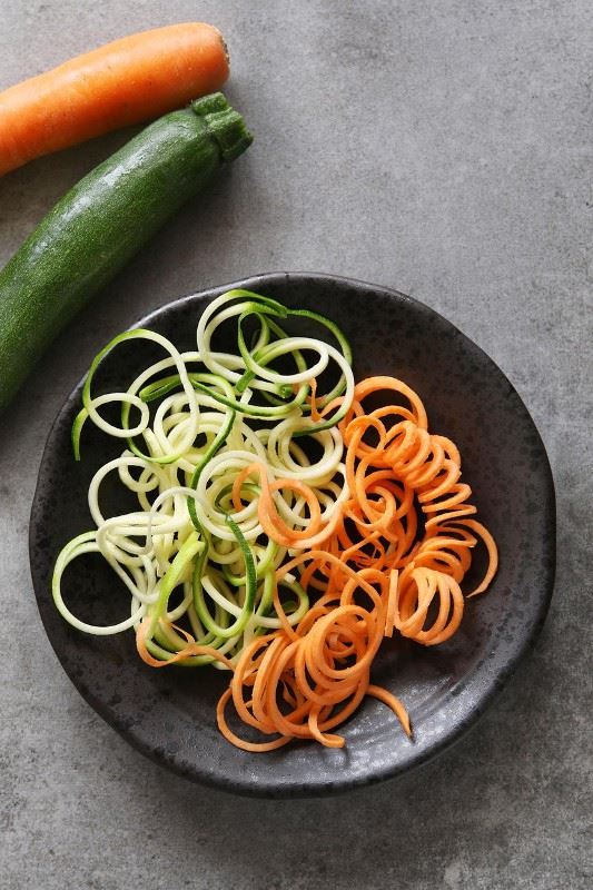 Dodajte kuhani ječam, dobro promiješajte i pospite čilijem u prahu. Ulijte pasiranu rajčicu i sačuvani temeljac te kuhajte još 15 minuta uz često miješanje. Za to vrijeme operite i očistite tikvice i preostalu mrkvu pa spiralizatorom od njih napravite špagete ili ih guljačem za povrće ili mandolinom narežite na tanke rezance. Lagano posolite i nauljite te dobro promiješajte.