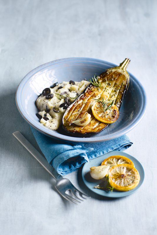 Patlidžan operite, odrežite mu peteljku pa ga prerežite po dužini. Meso uzdužno zarežite nožem i stavite u posudu za pečenje. Natrgajte iglice ružmarina, sitno ih nasjeckajte i pomiješajte s lovorom, neoljuštenim češnjakom, kriškama limuna i maslinovim uljem. Prelijte preko patlidžana, posolite i popaprite. Pecite u pećnici oko 20 minuta, uz povremeno okretanje.