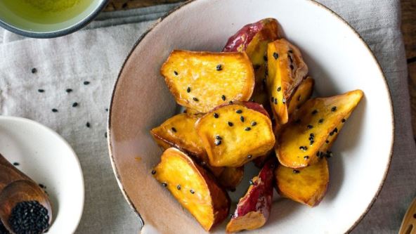Za ove recepte trebat će vam japanski slatki krumpir naziva Satsumaimo. Prepoznatljiv je po svojoj kori ljubičaste boje, koja potječe od antocijanina poznatog po poboljšavanju vidnih funkcija. Ujedno ovo korijenasto povrće sadrži i jalapin – bijelu tekućinu koja pridonosi boljitku rada crijeva i pomaže pri obnovi kože. Bogat je i vitaminima C i E, a obiluje kalijem.