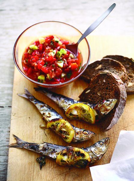 Srdelama odstranite utrobu i posolite ih. Prepržite pinjole. Nasjeckajte češnjak, mladi luk, feferon, peršin i mentu. Dodajte pinjole. Posolite, popaprite, poprskajte maslinovim uljem, izmiješajte i ugurajte u utrobu srdela. Limun operite i narežite na tanke kolutove. Uzicom zavežite po jedan kolut limuna na utrobu svake ribe kako bi smjesa ostala unutra. Poprskajte maslinovim uljem. Pecite na zagrijanom roštilju 2-3 minute sa svake strane. Poslužite uz gazpacho salsu.