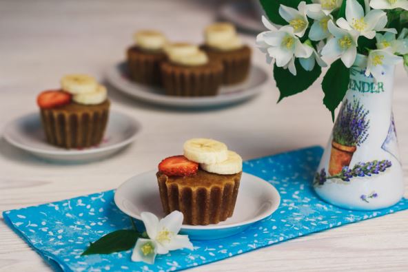 Pećnicu zagrijte na 180 stupnjeva. U otvore kalupa za muffine stavite papirnate košarice. Jagode operite, posušite i očistite; odvojite 50 g, a ostatak stavite u blender. Jednu bananu očistite i narežite te dodajte u blender sa žličicom limunova soka i smiksajte s jagodama u pire. Pomiješajte obje vrste brašna s praškom za pecivo. Tome dodajte pire od voća i ulje te kratko promiješajte. Smjesom napunite kalupiće, otprilike dopola. Preostalu bananu očistite pa nju i jagode narežite na tanke ploške i prelijte limunovim sokom. Po površini muffina naizmjence rasporedite ploške banane i jagoda tako da se preklapaju. Stavite u zagrijanu pećnicu i pecite na 180 stupnjeva 22 do 25 minuta. Ostavite da se muffini kratko hlade u kalupu, a zatim ih izvadite i do kraja ohladite na rešetki.