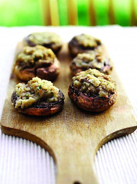Šampinjone ogulite i obrišite kuhinjskim papirom. Odstranite stručak, nasjeckajte ga i pomiješajte s češnjakom, mrvicama, peršinom, bosiljkom i sirom. Šampinjone premažite uljem. Unutrašnjost šampinjona napunite smjesom. Pecite na roštilju samo s vanjske strane.