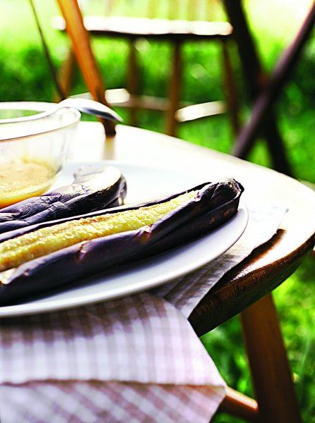 Istucite vrhnje. Zagrijte maslac, dodajte šećer, cimet i rum. Miješajte na vatri dok se šećer ne otopi. Dodajte vrhnje. Miješajte dok ne dobijete ujednačenu smjesu. Skinite s vatre. Položite neoguljene banane na roštilj. Pecite dok koža ne pocrni i dok se ne počne odvajati, odnosno pucati. Sklonite banane s vatre i ohladite toliko da se mogu oguliti. Poslužite uz umak od ruma i cimeta.
