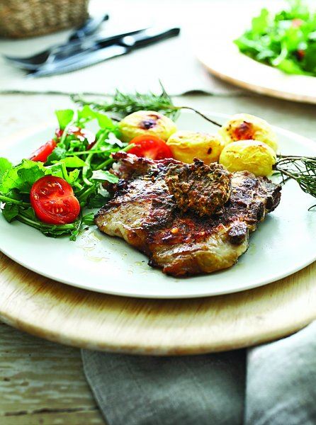 Maslac stavite na sobnu temperaturu. U mužaru usitnite srdele, češnjak, peršin, sušene rajčice i mladi luk dok se sve ne pretvori u kašu. Dodajte maslac i limunov sok. Sve zajedno dobro promiješajte. Kotlete operite, posušite, istucite, posolite i popaprite. Za vrijeme pečenja premazujte ih aromatiziranim maslacem. Kad su pečeni, na svaki odrezak stavite žlicu maslaca. Poslužite s pečenim krumpirom i salatom od rikole i rajčice. Preostali maslac zamotajte u alu-foliju u obliku valjka i spremite u hladnjak.