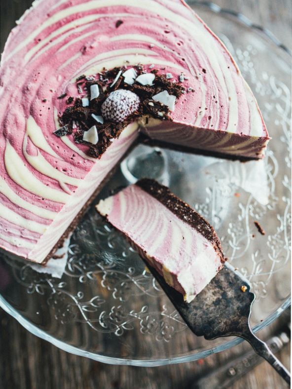 Za kremu sve sastojke miksajte dok ne dobijete gustu glatku smjesu. U pola smjese (oko 2 šalice) dodajte 2 šalice svježih ili zamrznutih jagoda. U kalup ćemo uliti prvo jedne kreme, pa druge i tako dok ne potrošimo obje kreme. Dobit ćemo lijepu prošaranu nježnoružičasto-bijelu tortu. Ukrasite svježim voćem i kokosovim čipsom. Spremite u hladnjak preko noći ili u zamrzivač na 4 sata.