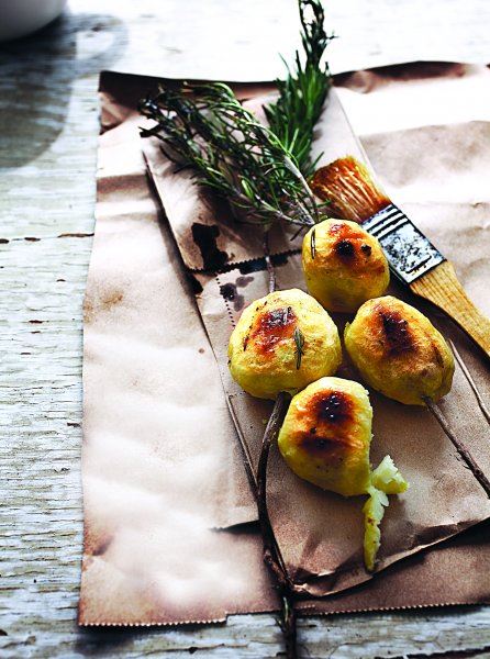 Operite grančice ružmarina i odstranite im iglice skoro do vrha, na vrhu ostavite oko 3 cm iglica. Krumpir skuhajte u slanoj vodi, ali ne do kraja. Ogulite ga, nabodite na štapiće od ružmarina, posolite i premažite uljem. Pecite na roštilju s obje strane.