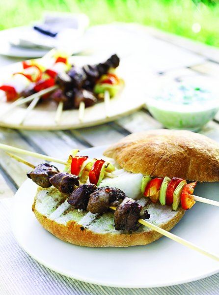 Narežite meso na kockice od 2 cm. Izmiješajte sastojke za marinadu i dobro promiješajte s mesom. Poklopite i ostavite nekoliko sati (idealno 4-8 h) da upije marinadu. Povremeno protresite ili promiješajte. Za to vrijeme namočite drvene štapiće u hladnu vodu. Izvadite meso iz marinade i ostavite na sobnoj temperaturi oko 30 minuta. Marinadu bacite. Meso složite na štapiće, ostavite malo mjesta između svakog komada jer će se tako jednakomjerno ispeći. Premažite maslinovim uljem. Složite ražnjiće od paprike i luka, premažite ih maslinovim uljem, posolite i popaprite. Poslužite zajedno s ražnjićima od mesa i uživajte u okusima Grčke.