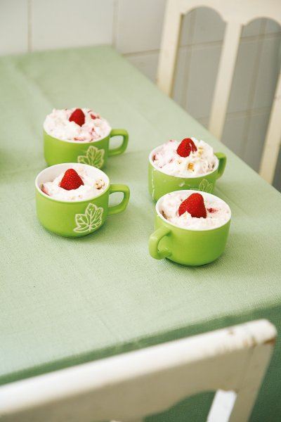 Očistite, operite i narežite jagode na četvrtine. Natrgajte gotov biskvit i rasporedite u 6 šalica. Na biskvit nanesite puding od vanilije, jagode i šlag. Sve lagano izmiješajte i stavite u hladnjak pola sata.