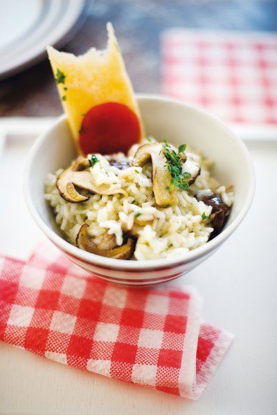 Na maslinovom ulju i maslacu zastaklite rižu. Dodajte češnjak, posolite i miješajući podlijevajte povrtnim temeljcem. Listiće vrganja popržite na maslacu pa dodajte u rižot zajedno sa sjeckanim timijanom. Posolite.