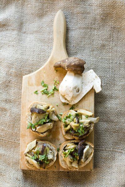 Vrganje očistite i izrežite na listiće. Kruh nakapajte s malo maslinova ulja pa zazlatite na gril tavi ili u pećnici. Vruće kriške kruha natrljajte češnjakom pa poslažite posoljene i maslinovim uljem nakapane listiće vrganja. Pospite peršinom.