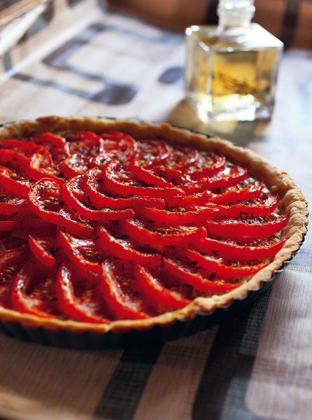 Razvaljamo tijesto za pitu u kalup koji smo namazali maslacem ili obložili papirom za pečenje. U zdjelici izmiješamo vrhnje i senf te žlicom bogato namažemo dno tijesta. Rajčice operemo i narežemo na ploške.