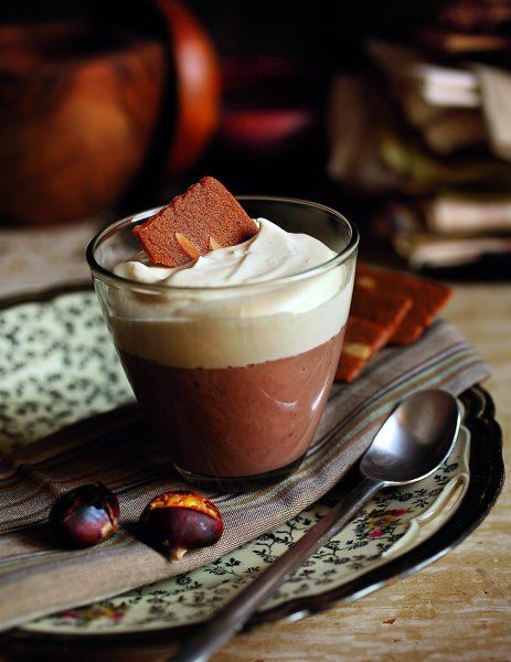 U čvrsti snijeg od bjelanjaka umiješajte šećer. Na pari rastopite čokoladu i pomiješajte s malo hladne vode, a zatim umiješajte žumanjke i pasirane kuhane kestene. Smjesu ulijte u namašćeni i pošećereni kalup za puding pa kuhajte na pari 1 sat. Poslužite s tučenim slatkim vrhnjem.