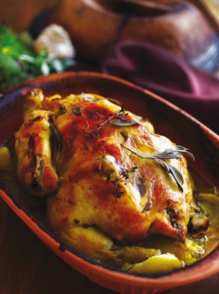 Nekoliko sati prije pečenja operite piletinu, dobro je nasolite izvana i iznutra, popaprite, dodajte malo muškatnog oraščića pa premažite ružmarinom, timijanom i kaduljom. U šupljinu pileta stavite oguljeni limun izrezan na 4 dijela (korica će vam trebati poslije) i spremite u hladnjak. Namočite glinenu posudu u vodu najmanje 10 minuta. Na dno još mokre posude stavite posoljene cijele krumpire. Dodajte pile, limunovu koricu i češnjak. Zalijte mlijekom i poklopite. Stavite u hladnu pećnicu i uključite je na 190 stupnjeva. Pecite sat i pol. Kad je pečeno, izvadite iz pećnice. Izvadite limun iz unutrašnjosti i pile izrežite na komade. Krumpire i češnjak zgnječite, podlijte sokom koji se stvorio prilikom pečenja. Poslužite vruće.