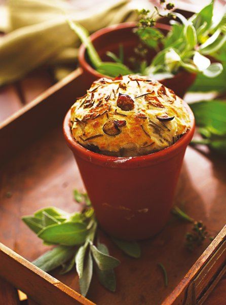 Obje vrste brašna prosijte na radnu površinu, u sredini napravite udubinu i u nju izlijte kvasac razmućen u 4 dl mlake vode, 1 dl ulja i malo soli. Pomiješajte sastojke, energično umijesite tijesto i na kraju ga oblikujte u loptu. Površinu tijesta premažite polovinom preostalog ulja, umotajte ga u prozirnu kuhinjsku foliju i ostavite na toplome da se diže oko 1 sat. Namočite teglice u vodi najmanje 10 minuta. Tijesto razvucite i pomiješajte s maslinama i ružmarinom, kratko zamijesite i stavite u glinene teglice koje ste premazali preostalim uljem. Pokrijte tijesto prozirnom kuhinjskom folijom i ostavite 30 minuta, dok ne udvostruči volumen. Tijesto pecite oko 50 minuta na 180 stupnjeva dok se na površini ne stvori rumena korica.