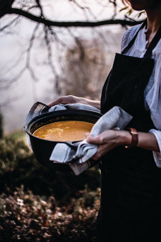 Luk nasitno narežite, naribajte ili sitno nasjeckajte češnjak, bundevu narežite na kocke, a mrkvu na ploške. Na 1 žlici maslinova ulja pirjajte luk (u hladnu posudu za kuhanje ulijte ulje, odmah dodajte luk i tek onda stavite na vatru). Dodajte mrkvu, bundevu, češnjak, začine, sol i vodu. Ako ne koristite shoyu umak, treba još posoliti. Dodajte vode samo toliko da pokrije povrće (oko 1 l). Kad provri, smanjite vatru i poklopljeno kuhajte 15 minuta. Zatim dodajte zobene pahuljice i kuhajte još 3 - 4 minute. Ugasite plamen i dodajte još 1 žlicu maslinova ulja. Izmiksajte u blenderu. Probajte je li dovoljno slano i začinjeno. Ako juha bude previše gusta, dodajte još malo vode i zagrijte je do vrenja. Možete je poslužiti sa zobenim ili sojinim vrhnjem, nasjeckanim peršinom ili mladim lukom i prženim sjemenkama bundeve.