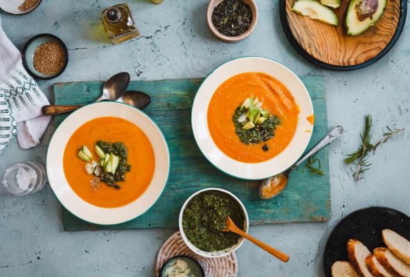 Malo pojačajte vatru da bi juha zakipjela, a potom vatru smanjite i kuhajte još 15 minuta. Pečene krumpire zarežite pa ih žlicom izdubite iz kore i dodajte u juhu. Maknite s vatre i smiksajte. Umiješajte sok limete pa posolite i popaprite, prema ukusu. Poslužite u zdjelicama, s kriškama avokada te nasjeckanim bučinim sjemenkama i začinskim biljem.