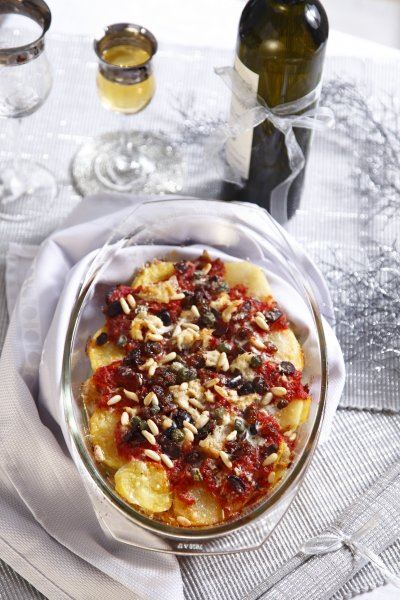 Očišćeni bakalar usitnite. Krumpir narežite na ploške i stavite kuhati u hladnu vodu s nekoliko prstohvata soli. Neka se kuha 3 minute, procijedite i ostavite da se malo ohladi. Za to vrijeme na maslinovom ulju popržite luk i dodajte rajčicu, kapare, masline, grožđice i pinjole. Pirjajte 3 minute i dodajte bijelo vino.