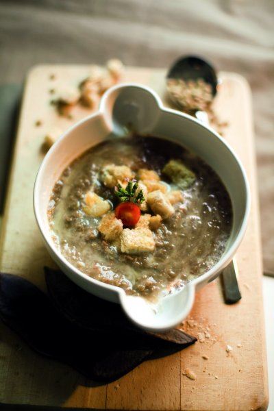 Na maslacu i maslinovu ulju popržite nasjeckani crveni luk i pancetu. Dodajte mrkvu, celer i lovor, posolite i pirjajte 10 minuta. Dodajte češnjak, leću i timijan pa podlijte vodom. Kuhajte dok se leća ne skuha. Propasirajte kroz gusto sito i dotjerajte gustoću juhe. Pileća prsa isjeckana na kockice posolite pa naglo i kratko zapržite. Potom ih kuhajte u juhi od leće i sve zajedno popaprite. Juhu poslužite s prženom piletinom i krutonima (prepržencima) od crnog kruha.