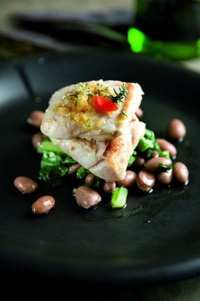 Grah namočite preko noći i kuhajte 1 sat. Od krušnih mrvica, maslinova ulja, začinskih trava i nasjeckanog češnjaka napravite smjesu. Riblje filete posolite, popržite na tavi i pospite smjesom od krušnih mrvica. Blitvu skuhajte u posoljenoj vodi i dobro ocijedite, pomiješajte s ocijeđenim grahom i začinite s malo češnjaka i maslinovim uljem, posolite i popaprite.