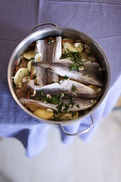 Mole namočite dan-dva i promijenite vodu 2-3 puta. Na ploške narežite četiri glavice luka i četiri krumpira. Na hladno ulje u loncu posložite najprije ploške luka, pa krumpira, pa na sve to stavite mole i tako red po red dok ima materijala. Zalijte vodom samo da pokrije složenac, a na vrh ubacite krupno narezana 4 češnja češnjaka, stručak svježeg peršina, sol i papar. Kuhajte pola sata.