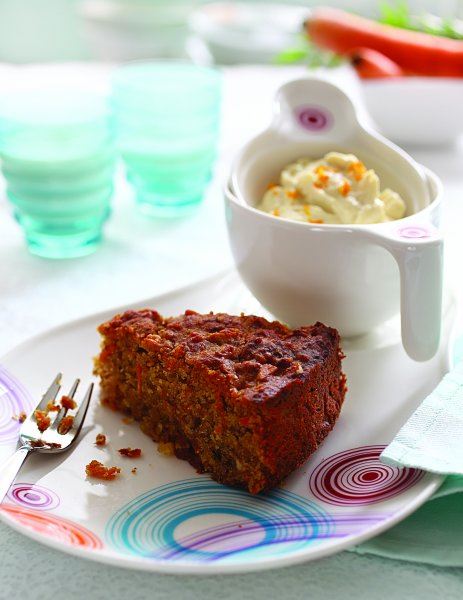 Zagrijte pećnicu na 180°C. Okrugli kalup promjera 22 cm premažite margarinom. Grožđice kuhajte u soku od višanja dok ne omekšaju. Kad se ohlade, promiješajte ih štapnim mikserom. U posebnoj posudi izmiješajte polubijelo i kukuruzno brašno, cimet, prašak za pecivo, sodu bikarbonu, kokosovo brašno i lješnjake. U drugoj posudi izmiješajte tekuće sastojke: sirup od agave, ulje, narančin sok i pire od grožđica. U tekuću smjesu dodajte mrkvu pa izlijte na suhe sastojke i lagano promiješajte. Ulijte tijesto u kalup i pecite 45-50 minuta. Kad se torta potpuno ohladi, izvadite je iz kalupa i premažite kremom.