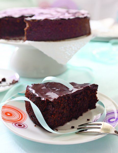 Zagrijte pećnicu na 180°C. Okrugli kalup promjera 22 cm namažite margarinom. Naribajte čokoladu na sitno i pomiješajte s polubijelim brašnom, vanilin šećerom, rapadura šećerom, praškom za pecivo i sodom bikarbonom. Sameljite bademe i dodajte ih suhim sastojcima. U drugoj posudi pomiješajte tekuće sastojke: sok od jabuka i ulje, pa dodajte ciklu. Smjesi suhih sastojaka lagano primiješajte tekuće. Dobivenu smjesu izlijte u kalup i pecite 50 minuta. Kad se torta potpuno ohladi, prelijte je čokoladnom glazurom.