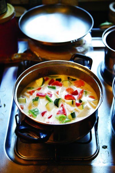 Narežite piletinu i povrće na komade od 1 do 2 cm. U posudi zagrijte curry pastu s 3 žlice ulja za kuhanje samo nekoliko sekundi kako bi otpustila okuse i mirise. Dodajte piletinu i kokosovo mlijeko. Kuhajte 20-ak minuta na laganoj vatri. Dodajte ostalo povrće, bambus i listiće limete (lime leaves). Kuhajte još 20 minuta na srednjoj vatri. Poslužite s rižom dugog zrna kuhanom na pari.