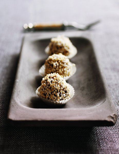 Na dasci valjkom sitno zdrobite kekse. Suhe smokve kuhajte u posoljenoj vodi dok ne omekšaju. Kad se ohlade, usitnite ih štapnim mikserom, dodajte trešnjevaču i kekse. Smjesu ostavite da odstoji u hladnjaku najmanje dva sata ili preko noći. Oblikujte kuglice koje ćete uvaljati u kokice od amaranta ili kokos.