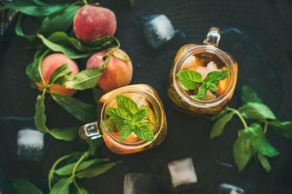 U vrč ulijte mineralnu vodu pa umiješajte kamilicu i lavandu. Poklopite i ostavite u hladnjaku otprilike jedan sat. Za to vrijeme u mali lonac stavite sirovi šećer, ulijte 5 žlica vode pa kuhajte na laganoj vatri dok se šećer potpuno ne rastopi, a mješavina zakipi. Ostavite da se taj sirup potpuno ohladi. Čaj izvadite iz hladnjaka i procijedite, ponovno ulijte u vrč te umiješajte ohlađeni sirup. Breskve operite, očistite (ne trebate ih guliti) i narežite pa dodajte u čaj. Poklopite i ostavite u hladnjaku još najmanje 3 sata kako bi se čaj prožeo aromom bresaka. Poslužite hladno, po želji s malo svježe iscijeđenoga limunova soka.