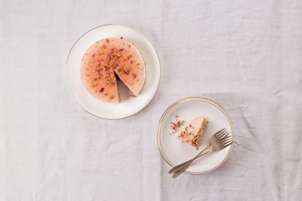 Indijske oraščiće namačite nekoliko sati u mješavini vode i ružine vodice kojoj ste dodali žličicu soka od cikle. U snažnom blenderu prvo miksajte bademe i datulje dok ne nastane ljepljiva smjesa. Odvojite žličicu ove smjese za bazu i stavite je u hladnjak da se stisne, a ostatkom obložite dno kalupa za torte promjera oko 20 cm. Potrudite se da smjesu dobro poravnate i „zatvorite“ rupice kako bi u potpunosti popunila dno kalupa i da ne bi iscurila smjesa koju ćete poslije izliti po njoj.
