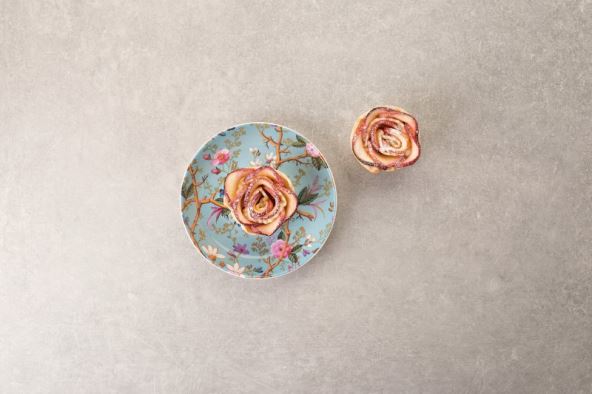 Presavijte donji dio tijesta preko jabuka te ga potom savijte tako da izgleda kao ruža. Isto napravite i s ostalim jabukama i trakama tijesta. Pecite otprilike 20 minuta na 180 °C. Pospite šećerom u prahu i poslužite.