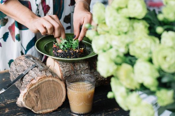 Netom prije oblikovanja prelijte limunovim sokom i maslinovim uljem te posolite i popaprite. Ponovo pažljivo promiješajte. Na svakom tanjuru pomoću okrugloga kalupa oblikujte smjesu. Uz rub utisnite sjemenke crnoga sezama pa sve ukrasite listićima svježeg peršina.