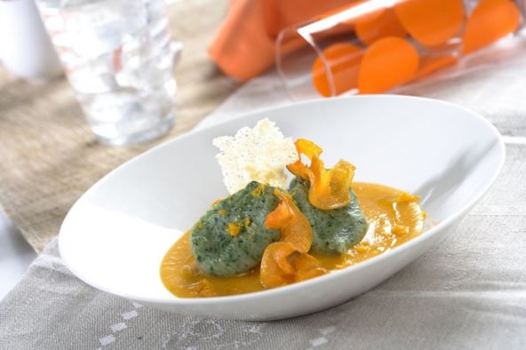 Zamrznuti špinat stavite na tavu pa ostavite na laganoj vatri oko 15 minuta da se odmrzne te da ispari voda. Za to vrijeme pripremite povrće za umak: buču ogulite i narežite na kockice, a poriluk ili ljutiku očistite i nasitno nasjeckajte. U širokom loncu na srednjoj vatri zagrijte ulje pa na njemu 3-4 minute propirjajte poriluk ili ljutike. Dodajte narezanu buču, posolite i pospite kajenskim paprom te pirjajte još nekoliko minuta. Podlijte vinom i pirjajte dok ne ispari. Nastavite pirjati na laganoj vatri, podlijevajući vodom, dok buča ne omekša. Potom umak maknite s vatre i smiksajte štapnim mikserom.
