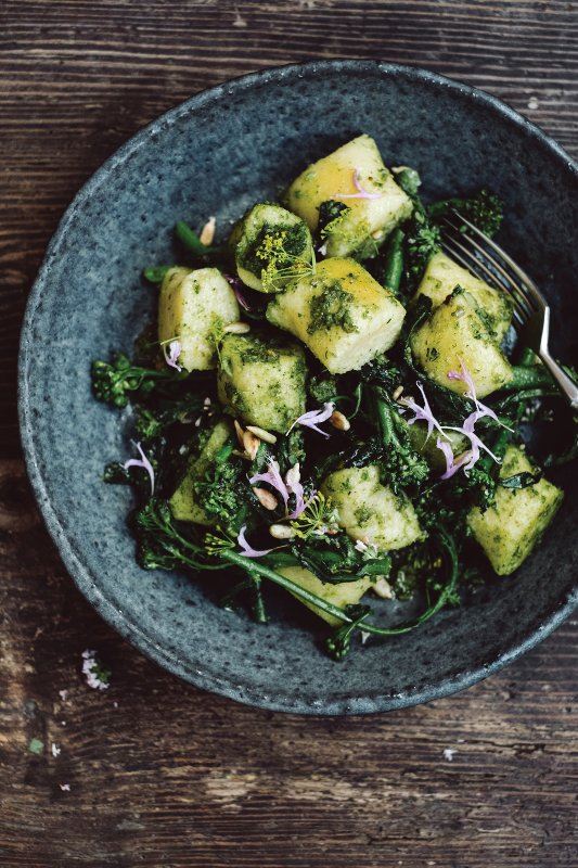 Zagrijte pećnicu na 220 °C. Njoke kratko prokuhajte i ocijedite. U posudu za pečenje stavite brokulu i njoke, prelijte maslinovim uljem i pospite nasjeckanom čili papričicom. Promiješajte rukama pa stavite u pećnicu na 15 minuta. Dodajte 150 g nasjeckanog špinata i vratite u pećnicu na 2 minute, promiješajte. Ostatak špinata i ostale sastojke za pesto izmiksajte u multipraktiku, po potrebi začinite i nakapajte po njokima s brokulom.