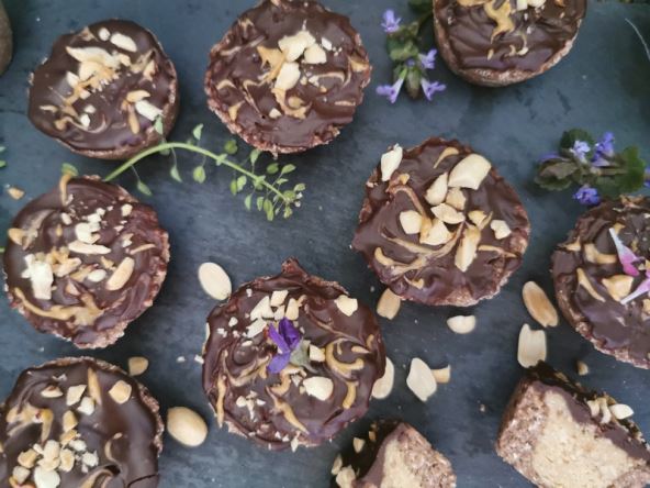 Nadjevene košarice prelijte topljenom čokoladom koju ste topili s malo kokosova ulja i biljnoga mlijeka. Na čokoladni preljev čačkalicom nanesite maslac od kikirikija crtajući nepravilne linije. Pospite nasjeckanim kikirikijem. Prije posluživanja hladite ih 30 minuta u hladnjaku.
