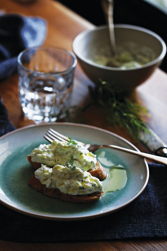 U drugu posudu stavite skutu ili quark, dodajte grčki jogurt ili kiselo vrhnje, posolite pa sve dobro izmiješajte. Dodajte protisnuti češnjak, maslinovo ulje, limunov sok i nasitno nasjeckani kopar pa sve još jednom dobro izmiješajte.