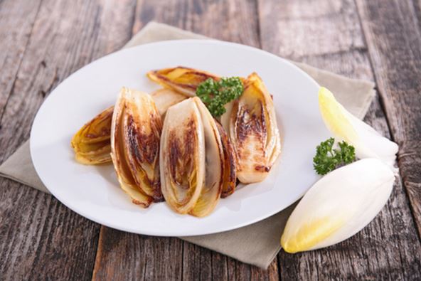 - Otopite ghee u velikoj teškoj tavi na srednje jakoj vatri. Dodajte endiviju i pirjajte nekoliko minuta sa svake strane, okrećući jednom, dok ne porumeni, ali još uvijek ostane čvrsta u sredini.