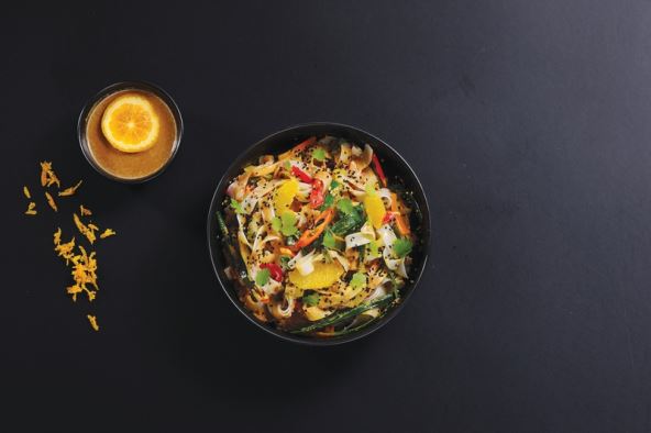 Na vruće ulje u woku stavite povrće i pržite 1 minutu uz povremeno miješanje. Dodajte rižine rezance i umak, dobro promiješajte i poslužite s crnim sezamom i nasjeckanim svježim peršinom.