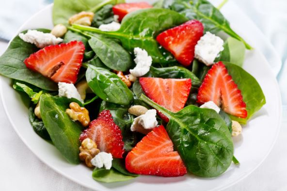 - Po špinatu izmrvite fetu, dodajte narezane jagode i krastavac te orašaste plodove.