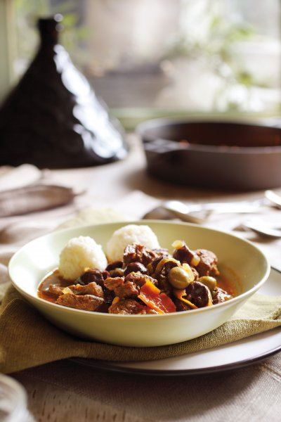 U tagini (arapska zdjela za pečenje s poklopcem; poslužit će i druga teška posuda s odgovarajućim poklopcem) zagrijte žlicu maslinovog ulja i na njemu kratko popržite komade junetine. Premjestite ih u zdjelu sa strane. U taginu dodajte ostatak ulja pa na njemu pirjajte luk dok ne omekša. Dodajte češnjak, začine, koru naranče i koncentrat rajčice. Promiješajte. Dodajte meso koje ste popržili i temeljac. Kad tekućina zakipi, smanjite vatru i lagano kuhajte sat i pol. Dodajte šljive i masline pa kuhajte još najmanje pola sata. Izvadite koricu naranče, pospite svježe sjeckanim peršinom.