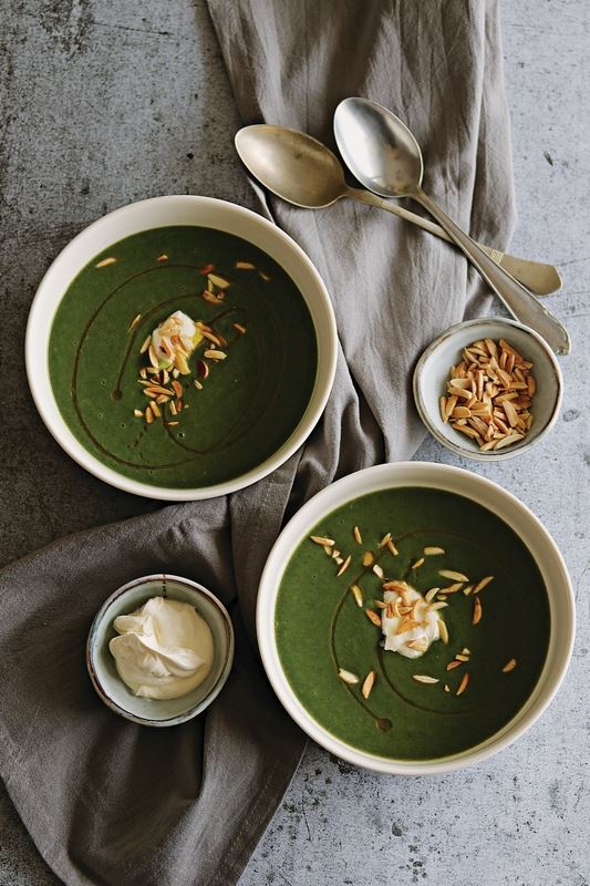 Poslužite u dubokim tanjurima uz dodatak crème fraîchea ili biljnog vrhnja, po izboru, te pospite sjeckanim tostiranim bademima.