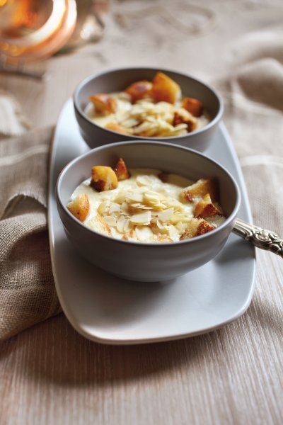 U blenderu dobro promiješajte slatko vrhnje i bademe, dodajte vanilin šećer i hladno mlijeko. Smjesu stavite u posudu pa na laganu vatru da se kuha 15 minuta. Za to vrijeme narežite žemlju na kockice i popržite ih na tavi. Popržene kockice žemlje stavite u tanjur i prelijte ih juhom.