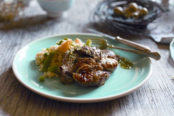 U mužaru istucite sjemenke korijandra, papar, listove kadulje i timijana te na kraju češnjak. U zdjeli pomiješajte maslinovo ulje, sok i koricu limuna, sol i sastojke koje ste usitnili u mužaru. Janjeći but stavite u zdjelu i dobro natrljate marinadom, a zatim zdjelu pokrijte plastičnom folijom i ostavite u hladnjaku najmanje jedan dan. Nakon toga meso stavite u lim za pečenje i pecite u pećnici na 180 stupnjeva najmanje 2 sata. Kad je pečeno, izvadite ga iz lima, pokrijte alu folijom i ostavite 10-ak minuta. Zatim ga narežite i polijte umakom od mente. Poslužite s kuskusom i povrćem.