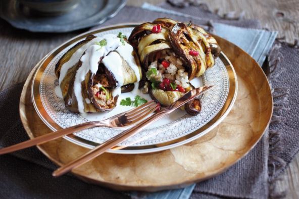 Patlidžane operite, poprečno narežite na kriške debljine 1-1,5 cm, posolite i ostavite da odstoje nekoliko minuta. Kad puste vodu, obrišite ih kuhinjskim papirom, premažite maslinovim uljem, složite na lim obložen papirom za pečenje i pecite u pećnici na 200 stupnjeva dok ne dobiju boju. Narežite luk i zažutite ga na maslinovom ulju. Dodajte komadiće piletine i paprike. Posolite i popaprite po želji, kratko popržite pa dodajte rižu. Dolijevajte temeljac dok riža nije skuhana. Kriške patlidžana složite zvjezdasto, a u sredinu stavite smjesu s rižom. Poklopite kriškama patlidžana i zamotajte smjesu. Zapecite na 200 stupnjeva 15 minuta.