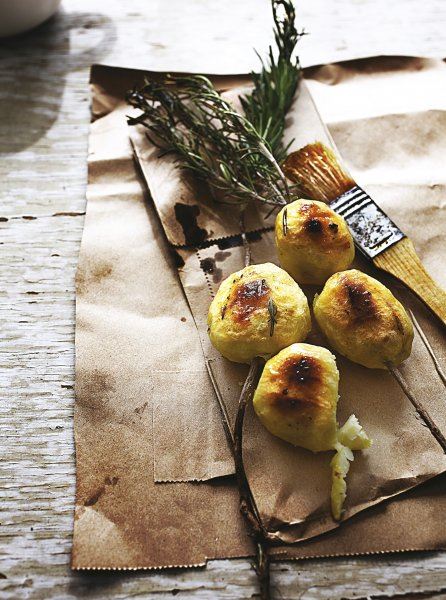 Operite grančice ružmarina i odstranite im iglice gotovo do vrha - na vrhu ostavite oko 3 cm iglica. Krumpir skuhajte u slanoj vodi, ali ne do kraja. Ogulite ga, nabodite na štapiće ružmarina, posolite i premažite uljem. Pecite na roštilju s obje strane.