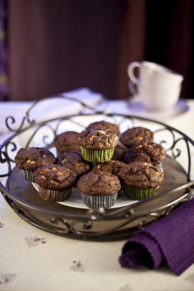 Grožđice namočite u malo tople vode 10 minuta. Bijelu čokoladu narežite na kockice. U većoj posudi pomiješajte sve suhe sastojke (crno brašno, pšenično integralno brašno, rogač, bijelu čokoladu, prašak za pecivo, vaniliju u prahu, sodu bikarbonu, rapadura šećer, sol). U drugoj posudi pomiješajte sve tekuće sastojke (sojino mlijeko, ulje, slad). Tekućim sastojcima dodajte ocijeđene grožđice pa tu smjesu ulijte u posudu sa suhim sastojcima. Lagano miješajte dok se sastojci ne prožmu. U kalup za muffine položite 12 papirnatih čašica i rasporedite smjesu. Pecite 35 minuta u pećnici zagrijanoj na 200 stupnjeva.