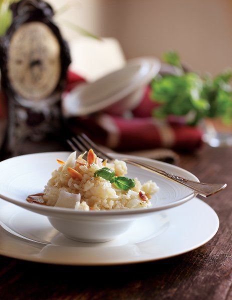 Zagrijte široku posudu u kojoj ćete kuhati rižot, rastopite žlicu maslaca i na njemu propirjajte sitno nasjeckani luk. Kada luk omekša, dodajte naribane jabuke koje ste prethodno poprskali sokom od limuna kako ne bi potamnile te ribanu koricu limuna. U drugoj zdjeli rastopite ostatak maslaca i dodajte rižu. Rižu pirjajte nekoliko minuta pa dodajte blago zagrijano vino. Kuhajte na laganoj vatri neprestano miješajući. Kada vino ispari, dodajte luk i jabuke iz druge zdjele. Posolite i popaprite. Rižot kuhajte dalje stalno miješajući te dodajući malo po malo temeljca. Kad je riža al dente, ugasite vatru, dodajte slatko vrhnje, ribani parmezan i ostavite poklopljeno nekoliko minuta. Na kraju rižot pospite tostiranim bademima.